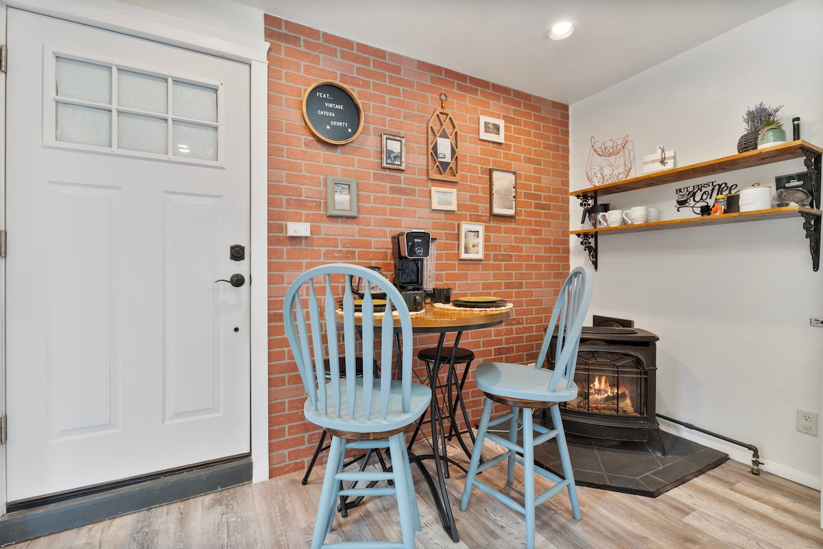 Luta dig tillbaka och koppla av i detta lugna, eleganta boende. Perfekt för en romantisk semester eller arbetsresa, denna nyrenoverade lägenhet förkroppsligar en fräsch boho känsla med vintage själ. Njut av den vackra utsikten ut genom det stora bildfönstret, laga mat i den bedårande och funktionella kokvrå eller koppla av i sängen vid gasspisen. Beläget i Auburns historiska distrikt och 1 minuts bilresa från Wegmans. Härifrån kan du enkelt komma åt butiker, restauranger och sevärdheter i centrum till fots.