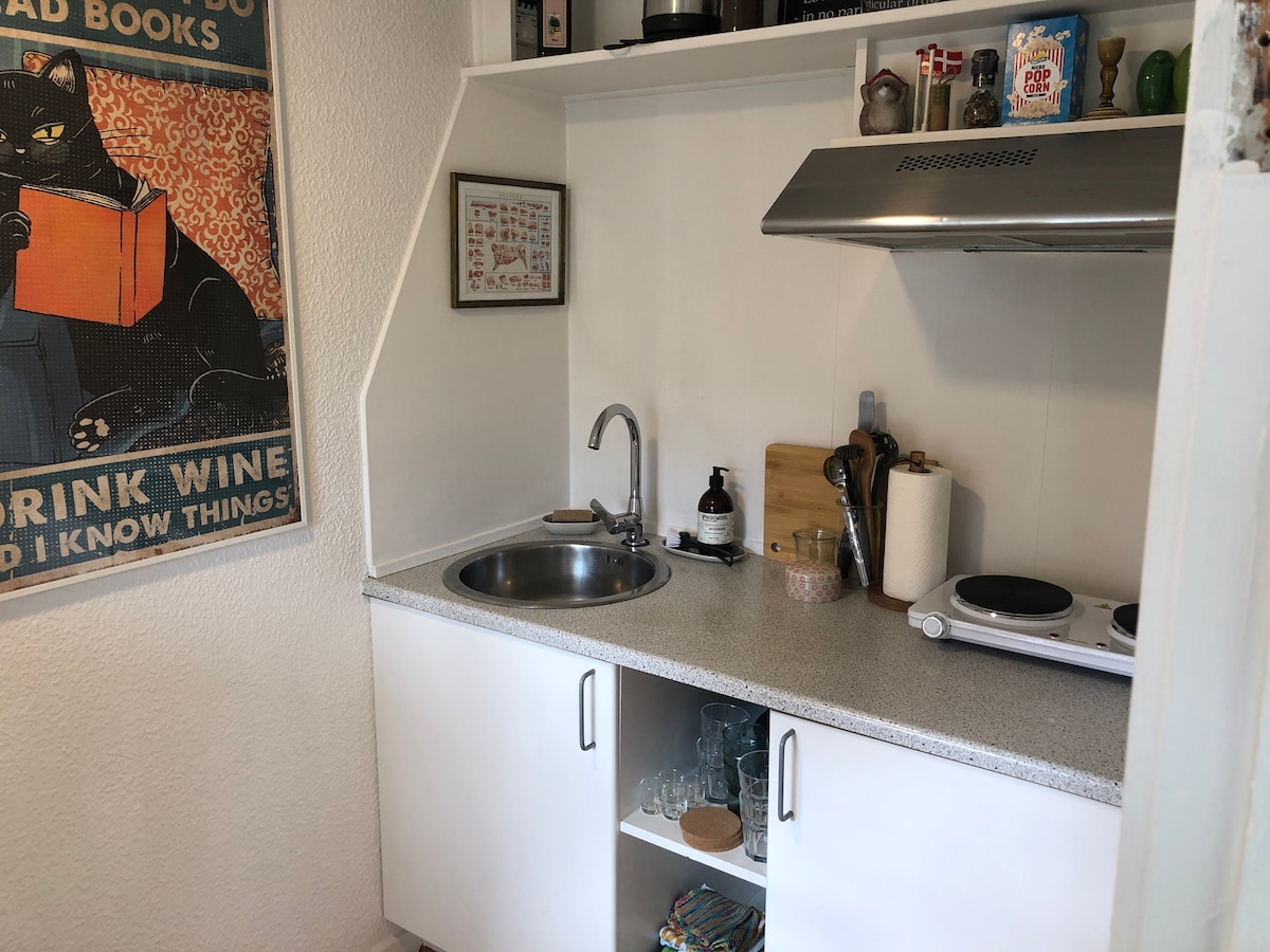 Du får din egen ingång till lägenheten. Från sovrummet ingång till TV-rummet/kök med möjlighet till bädd för 2 personer på bäddsoffan. Från TV-rummet finns det tillgång till eget badrum/toalett. Det kommer att finnas möjlighet att förvara saker i kylskåp med liten frys. Det finns en vattenkokare så att du kan göra kaffe och te. I pentryt finns 1 mobil spis och 2 små kastruller samt 1 ugn Det är inte tillåtet att steka i rummet. Kalla drycker kan köpas för 5 kr och vin 35 kr. Betala kontant eller med MobilePay.