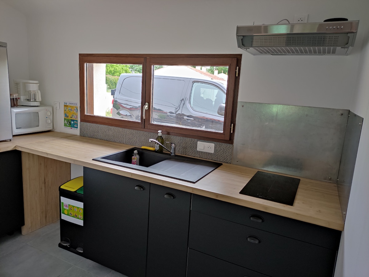 Charmig ny och ljus studio med utsikt över en liten exteriör tillsammans med en bocce-bana med utsikt över ett storkbo. Mezzanine vind, tillgång med avtagbara trappor, dubbelsäng med nät och skyddsräcke . Utrustat pentry (filterkaffemaskin, kylskåp, induktionsplatta), litet badrum (dusch), TV sittgrupp med bäddsoffa 2 ställen och wifi-åtkomst. Liten lugn by ligger 15 minuter från stränderna med bil