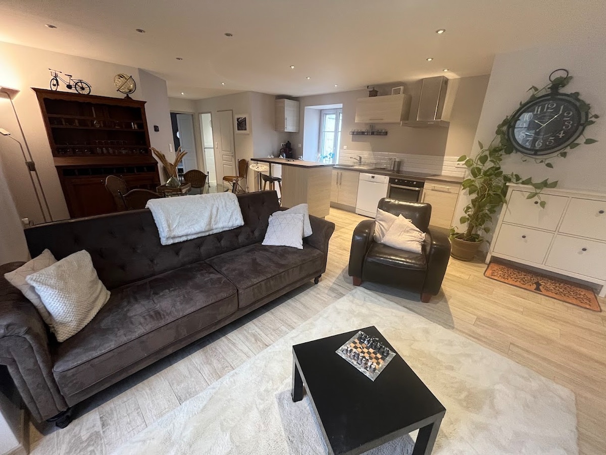 Koppla av i detta lugna och eleganta boende med kvalitetstjänster, utrustat med spa och bastu (för närvarande under reparation). I centrum av Vesoul i en säker och diskret byggnad; nära till restauranger och barer. Fri parkering i närheten. Boendet har toalett och separat badrum, utrustat kök (kylskåp, diskmaskin, kaffebryggare, etc.), rymligt sovrum och avkopplingsrum. TV med Netflix och Prime Video samt Wi-Fi.