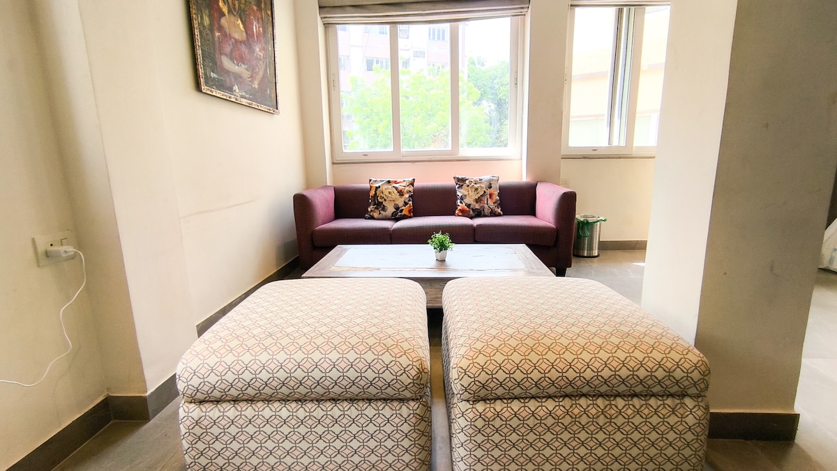 En vacker 2 sovrum med luftkonditionering, 2 badrum, ett öppet kök med vardagsrum och matplats, rymlig och luftig lägenhet på tredje våningen (ingen hiss) av 100 år gammal välskött byggnad, som ligger i hjärtat av staden. Detta boende är en perfekt kombination av antik look med moderna faciliteter. Denna plats är lätt att identifiera. Tryggt och säkert, enkel tillgång till restauranger-sjukhus-supermarknader- köpcentrum etc, enkel transport 24*7. Avgiftsparkering finns på vägen.