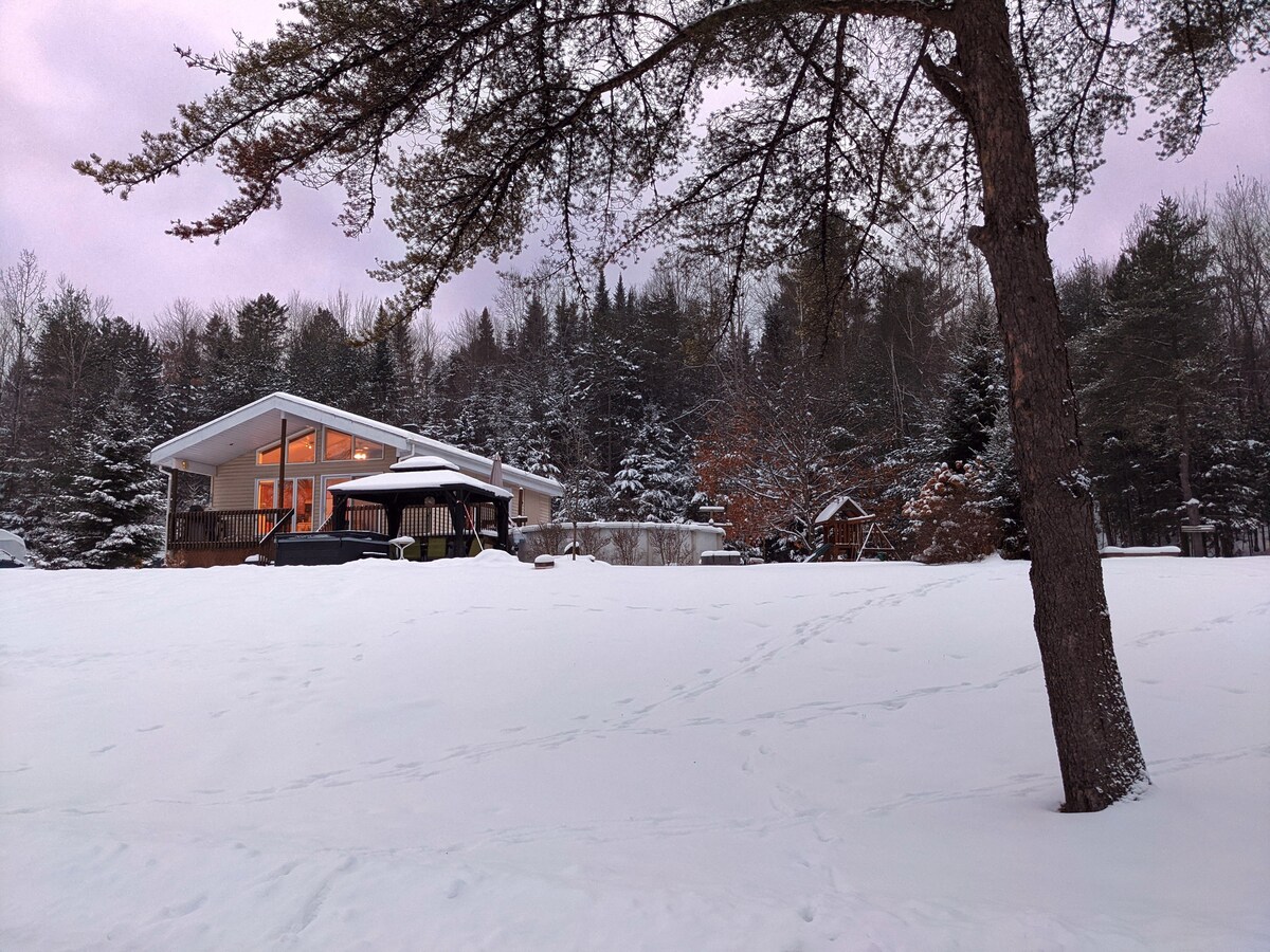 Mont Chalet ligger i Estrie i den lilla byn La Patrie. Ungefär femton minuter från Mont-Mégantic nationalpark. Denna stuga UTAN elektricitet, erbjuder dig den önskade komforten genom att vara helt oberoende. Vedeldad värme, kylskåp, spis och varmvatten fungerar med propangas och lamporna med 12 volts batterier. Skidåkning, snöskor och promenader är möjliga på denna 270 hektar stora mark. Ett besök och du kommer att bli förtrollad. Kom och beundra stjärnhimlen 🌟