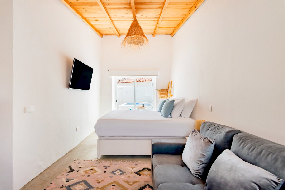 Casa Valentina är ett utrymme som välkomnar dig, tröstar dig och bjuder in dig att leva långsamt. Från de gyllene detaljerna som står i kontrast till den vita kalken, från poolen för varma dagar, till den mysiga eldstaden för kallare dagar, var varje hörn utformat för att förmedla elegans och lugn. Här är varje ögonblick en inre resa, där lugnet i Alentejo möter äktheten i ett utrymme som omfamnar oss och får oss att känna oss som hemma.