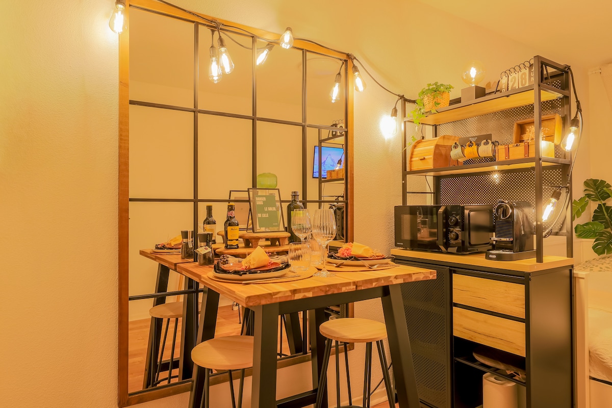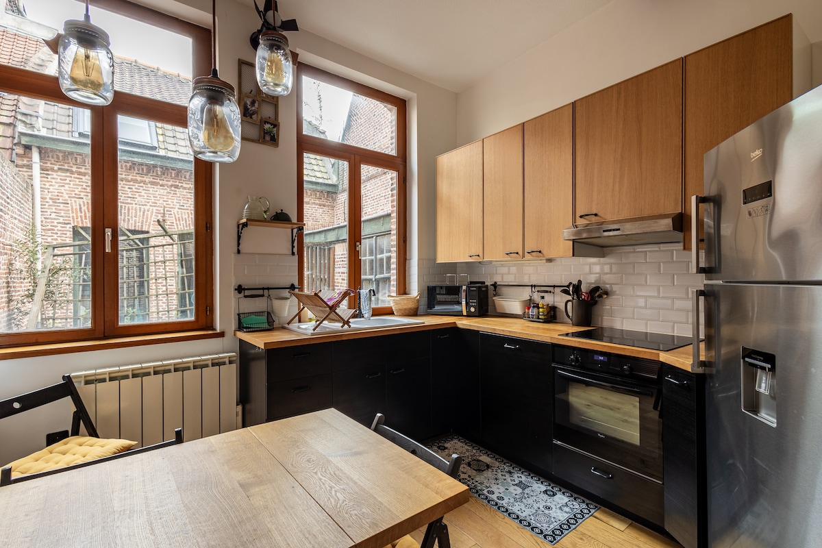 En charmig duplexlägenhet, smakfull inredning, mitt i hjärtat av Gamla Lille: - 10 minuters promenad från de 2 järnvägsstationerna Lille Flandres och Lille Europe - 10 minuters promenad från tunnelbanan Rihour eller tunnelbanan Lille Flandre - 5 minuters promenad från Grand-Place - 1,5 km (20 min promenad) från Zenith de Lille - 12 km från Grand Stade Pierre Mauroy i Villeneuve-d'Ascq (15 minuter med bil eller 40 minuter med tunnelbana) - 12 km från flygplatsen Lille-Lesquin Underjordisk parkering, V'Lille-cyklar, buss, ... allt finns i närheten.