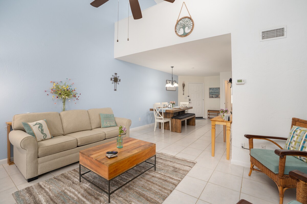 Välkommen till din oändliga sommar! Detta lättlevande 2 sovrum, 2 fulla badrum radhus har ett fullt utrustat kök, inhägnad i privat bakgård, bottenvåning sovrum, och en härlig uteplats med uteservering med en eldstad och grill. Fånga soluppgången på stranden och solnedgången med utsikt över intercostal, eftersom båda ligger bara en kort promenad bort (under 10 minuter)! Ren lugn, långt från liv och rörelse i centrala St. Augustine, men ändå mindre än 5 miles från vår historiskt värderade stad.