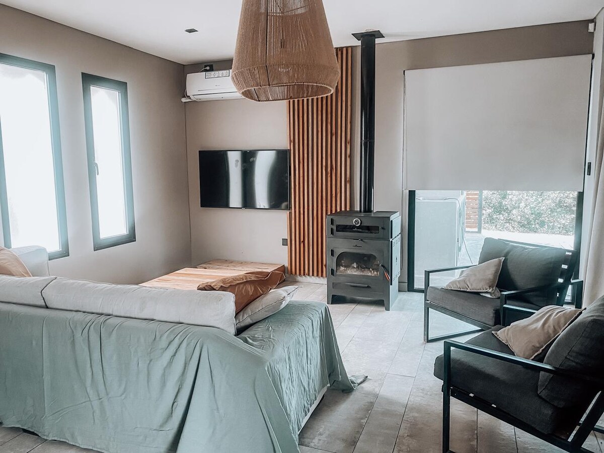 Huset har en utmärkt planlösning. Den har två våningar, ett sovrum på övervåningen med en dubbelsäng och ett stort skrivbord för distansarbete. Det har ett fullt utrustat badrum med skotsk dusch och högtrycksstrålar. En balkong erbjuder vacker panoramautsikt över bergen. Vardagsrummet har en bäddsoffa och en öppen spis. Det fullt utrustade köket har också ett utomhusdäck med enastående utsikt, ett utomhusbadkar, en grill, ett handfat och en eldstad i sten för att njuta av trädgården.