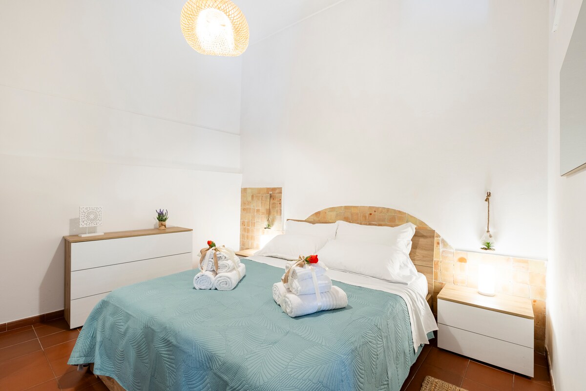 Stor enrumslägenhet på cirka 50 kvadratmeter, för 2 personer, bestående av ett stort öppet utrymme med dubbelsäng, med pentry och matplats och avkopplingsområde med en stor soffa; lägenheten har ett stort badrum med dubbla handfat och kompletteras med en stor dusch och ett badkar. Lägenheten ligger på första våningen och har privat tillgång till en stor balkong (ett bord, två stolar, två bekväma solstolar). Turistskatt på 3 € per person och dag som betalas vid ankomst.