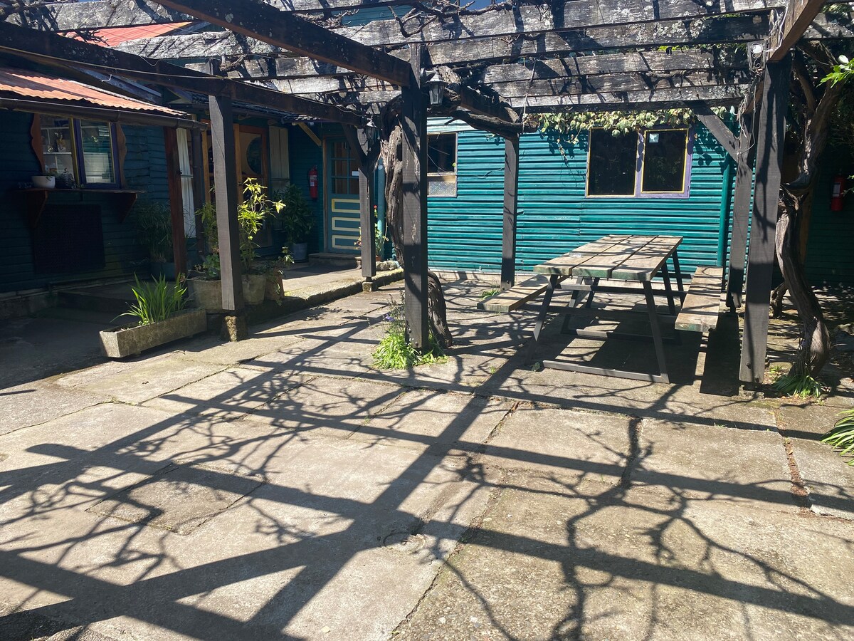 Tremannarum med eget badrum. Lugnt ställe. Hus på en 5 000 kvadratmeter stor tomt. Tillgång till Lago Villarrica 150 meter. Rustik miljö, landsbygd. 9 km från Villarrica och 15 km från Pucon. Kollektivtrafik 200 meter bort, frekvens ungefär var 15:e minut. Du kan använda köket och de gemensamma utrymmena i huset. Notera: Vi har katt hemma.