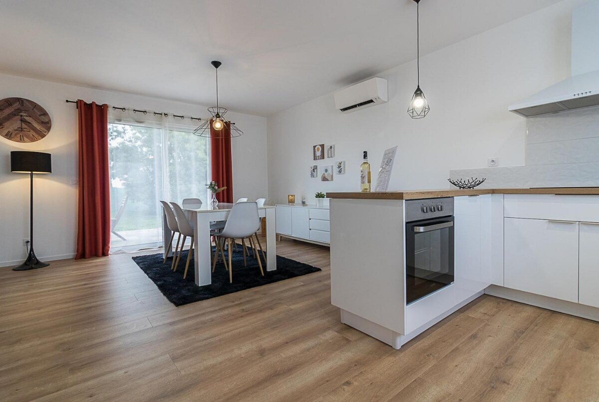 Nytt enplanshus 96 m2 i ett lugnt bostadsområde, nära Frontons stadskärna och alla bekvämligheter. Ljust och bekvämt, det är perfekt för en vistelse med familj eller vänner, även lämpligt för affärsresor. Klassificerad 3 stjärnor för 6 personer, vi kan ta emot upp till 8 personer med bäddsoffan. Privat trädgård 500 m2 under uppbyggnad samt staket, uteterrass, parkeringsplats framför huset.
