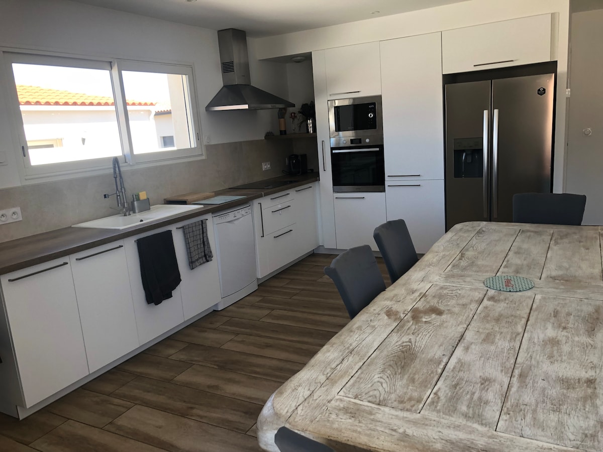 Mycket tyst och familjevänligt område att respektera! hyra från lördag till lördag eller endast på helger. 140 m2 hus i Villemolaque. 20 minuter från Spanien och stränderna. 65 m2 luftkonditionerat vardagsrum med biljard/bar, utrustat kök. 4 sovrum med 140 x 190 sängar med fläktar. 2 toaletter och 1 badrum. Stor terrass med 10-personers bord, 8 x 3 m pergola, grill, lounge och 7 x 3,5 m privat pool Lakan tillhandahålls. Carrefour butik 50 meter bort till fots.