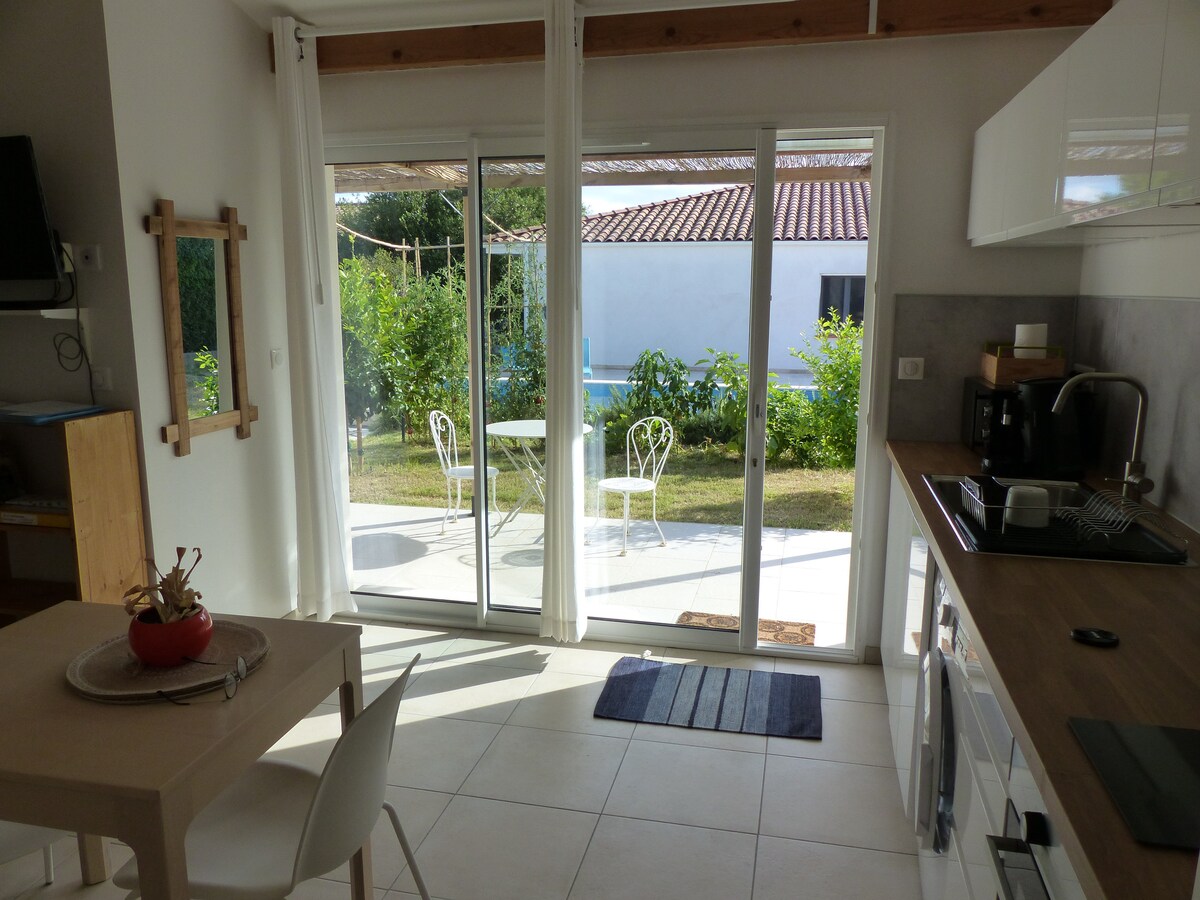 Studio 24 m2, terrass, trädgård med utsikt över poolen (7X3,5 m, oskyddad, ouppvärmd, delas med ägarna). Perfekt för par. Beläget i ett lugnt område, sydläge, ljust inre, nytt boende, miljöansvarigt, bekvämt och funktionellt, utrustat, sovrum, kök, badrum. Många natur- och kulturattraktioner i området. Mellan hav och buskmark, dina värdar kommer att välkomna dig med enkelhet. Butiker och grundläggande tjänster inom gångavstånd.