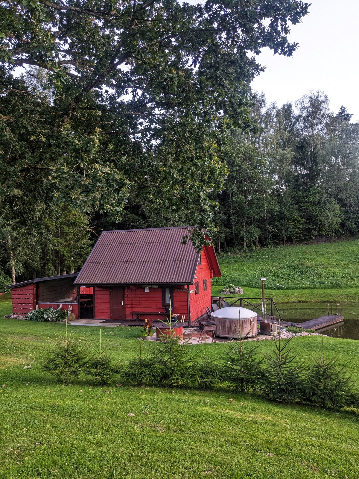 Det finns totalt tre stugor vid sjön i vårt område. Pond Cabin ligger 15 meter från dammen och 50 meter från sjön och är omgiven av skog. Stugan har alla nödvändiga bekvämligheter. Du kan också använda kolgrill, kanot, ljudsystem och vattenstudsmatta utan extra kostnad. Du behöver bara ta med ved eller kol för grillen. Musik får spelas utomhus fram till kl. 22.00. Vi erbjuder även bubbelpool och bastu för 100 €. Närmaste butik ligger 2 km bort.