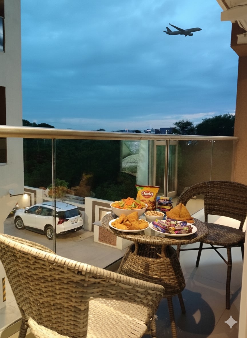 Experience refined comfort in this spacious studio just 2 mins from Pune Airport, located in the premium Viman Nagar area. Enjoy breathtaking views from the rooftop infinity pool, or unwind on your private balcony with a direct view of the runway, watching flights take off and land. The space features a cozy bed, smart TV, high-speed Wi-Fi, a well-equipped kitchenette, children’s play area, secure gated access, elevator, and seamless self-check-in for a truly elevated stay.