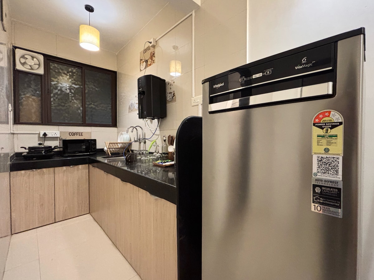 Välkommen till vår eleganta, mysiga 1 BHK-lägenhet som ligger 15 minuter från Pune flygplats. Njut av lugnet i denna moderna tillflyktsort utrustad med luftkonditionering för komfort. Streama sömlöst med upp till 100 Mbit/s WiFi och få bekvämt livsmedel med vår interna stormarknad. Njut av gratis te och kaffe när du varvar ner på premiummadrasser klädda i kvalitetslinne. Vi täcker dig med schampo och kroppsgel för en bekymmersfri vistelse. Upplev komfort och bekvämlighet när den är som bäst!