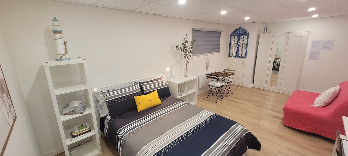 Tout le groupe appréciera l'accès simple et rapide à partir de ce logement au centre de tout. Le logement se situe au sous-sol d'une maison unifamiliale avec entrée séparée. Près des stations de Métro Cartier et De la Concorde et situé dans un croissant, très tranquille. A pieds de tous les services. L'appartement dispose d'une chambre -salon attenant au bachelor qui dispose d'un grand lit mural, une cuisine équipée, et une salle de bain. Stationnement Gratuit dans la rue.