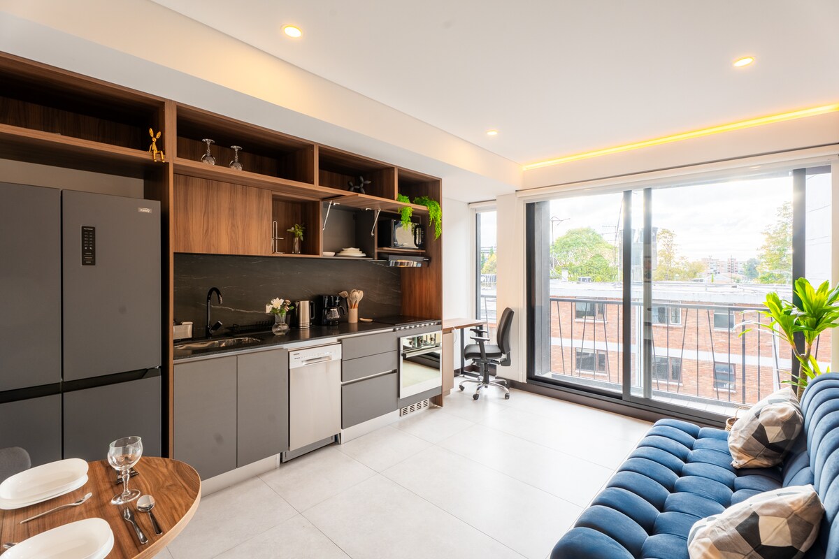 Upptäck Bogotá från denna moderna och bekväma lägenhet med en privat terrass som är unik i området, perfekt för att njuta av solnedgången, läsa, arbeta utomhus eller dela en kväll med en öppen spis. Perfekt för par, digitala nomader och resenärer, med strategiska plats nära turistområden, restauranger och kollektivtrafik. Utrustat kök, dubbelsäng och skrivbord för en oförglömlig vistelse Detta ställe har ett strategiskt läge: det kommer att vara mycket lätt att planera ditt besök!