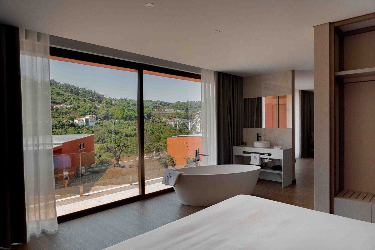 Detta rum erbjuder bekvämligheten av en dubbelsäng och ett privat badrum, vilket garanterar avskildhet och bekvämlighet under din vistelse på Casa Dona Edite. Dessutom kan du njuta av en hisnande utsikt över Douro-dalen, vilket ger en lugn och inspirerande atmosfär för våra gäster. Poolen är för alla på pensionatet.