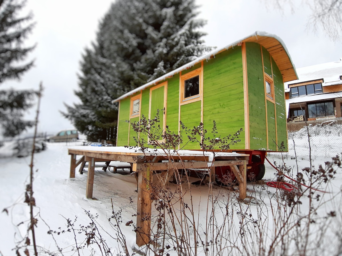 Husvagnen som står på den inhägnade tomten ligger nära sjön Lipno i området Slupečná. Den är isolerad och anpassad för användning året runt och med direkt uppvärmning. Husvagnen har en bäddsoffa (sänglinne och handdukar), bord med tre stolar, lådor, hyllor, kök med grundläggande utrustning (kylskåp, dubbel spis, mikrovågsugn, vattenkokare, kaffebryggare, bestick, koppar, bordsgrill) och en kemisk toalett. Dricksvatten finns i behållare och duschning tillhandahålls av en utomhus camping soldusch.