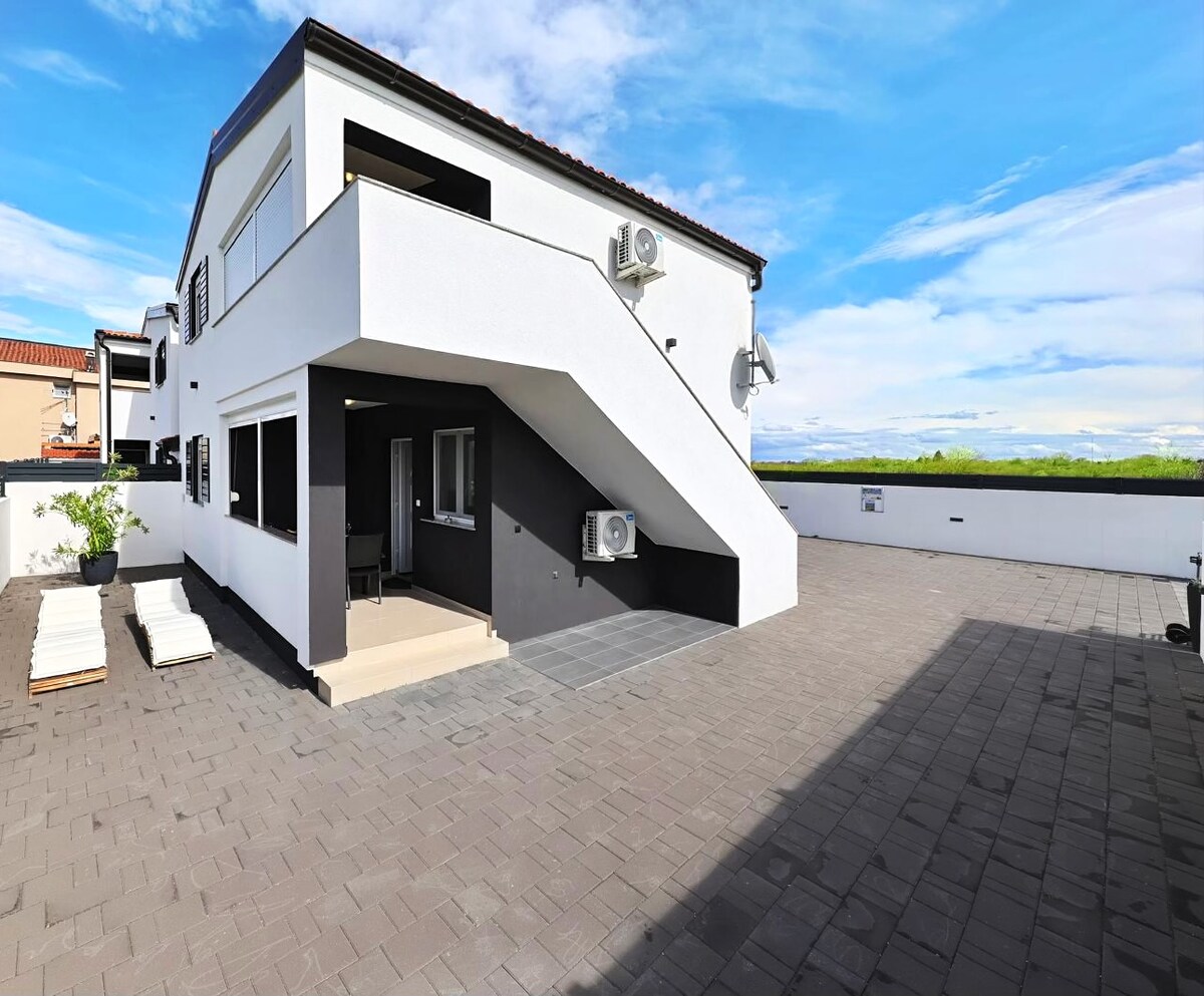 Den har en vacker utsikt över havet där Kraljičina och Ždrijac beach möts, hela staden och Velebit montain. Lägenheten är lyxigt och modernt inredd och består av två separata sovrum, kök, matsal, vardagsrum, badrum och en stor terrass. Egen takterrass med jacuzzi och grill. solstolar och parasoll. Den har wifi ,fri parkering ,luftkonditionering. Har golvvärme i hela lägenheten och en hemmabio. Fri parkeringsbiljett