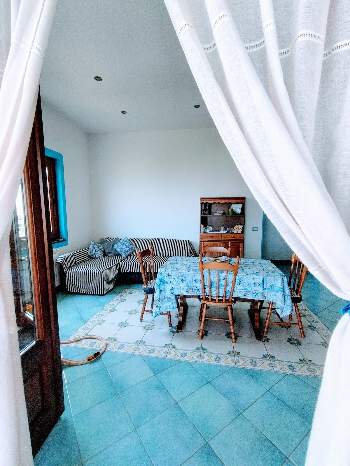 Our holiday home is on the 2nd floor, It consists of a kitchen / living room with a sofa-bed for one and a half, a bedroom and a bathroom with shower, as well as 2 large covered terraces with sea view and it can accommodate 2 to 4 people; The terraces are both equipped with tables and chairs for outdoor dining, there is a barbecue and a sun terrace with sun loungers.