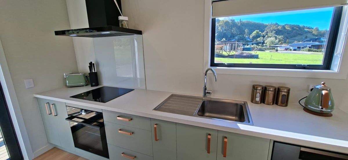 Modern arkitektonisk kiwi bach inbäddad i utkanten av en tidvattenlagun mellan Ligar Bay och Tata Beach. Bach är en kompakt 55 kvm med ett stort skyddat och täckt däck med hela dagen sol. Ett stort sovrum ansluter till en kompakt lounge och eget badrum, matplats och kök från båda sidor med full utsikt över vattnet och lagunen. Det finns en separat sovplats med en Queen size-säng 2 meter från huvudbostaden för ytterligare 2 gäster. Fantastisk andra varma utomhusdusch under träden.