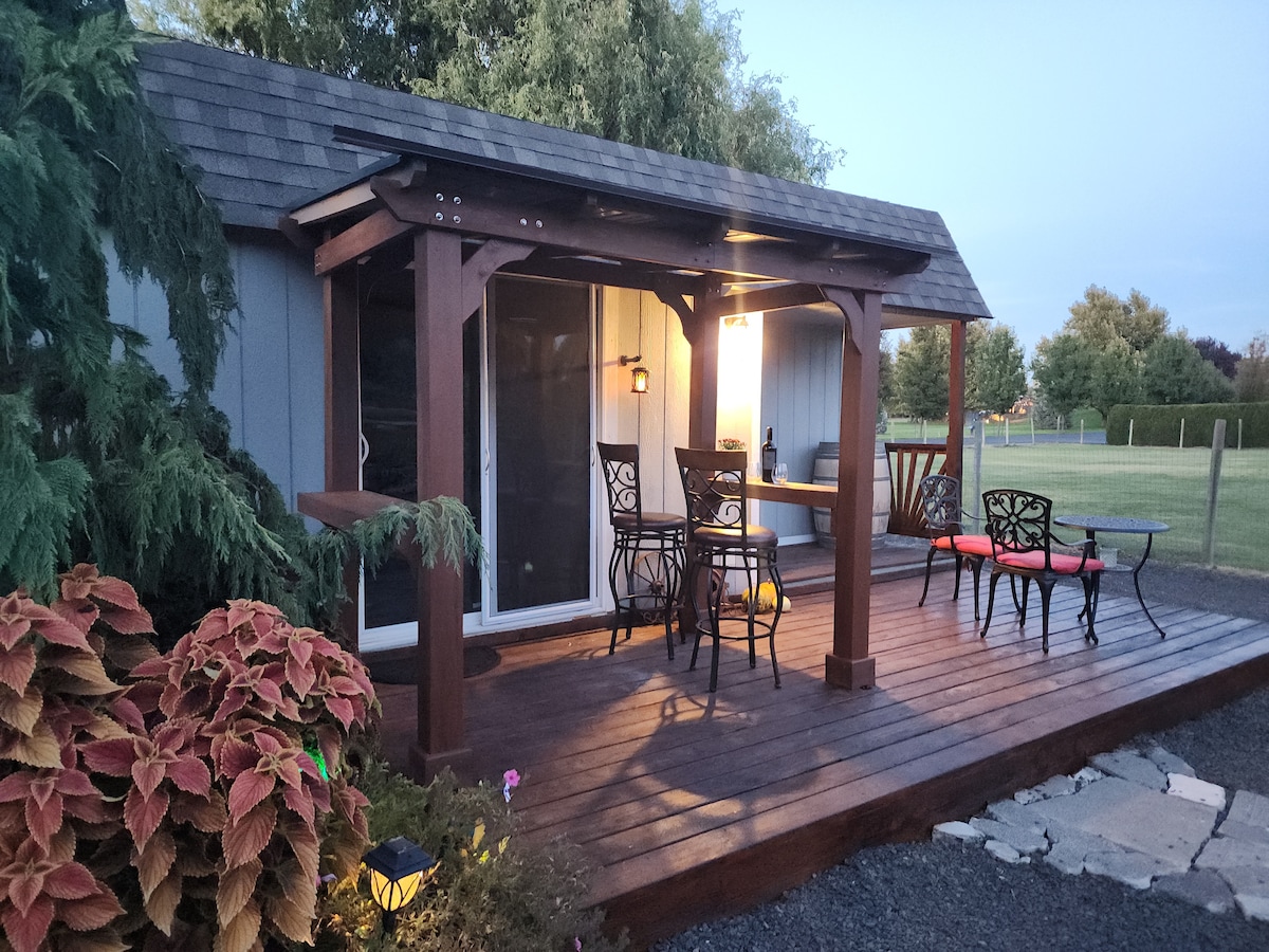 Denna härliga studiostuga är perfekt för en person och "mysig" för två. Den har utsikt över en grönsaksträdgård bakom huvudbyggnaden på den två hektar stora fastigheten, och ligger bara 1,5 miles från centrala Walla Walla. Vi hoppas verkligen att du kommer att njuta av din vistelse hos oss! Läs alla beskrivningar noggrant för att säkerställa att vår stuga erbjuder vad du letar efter och uppfyller dina behov för en bekväm och avkopplande vistelse.