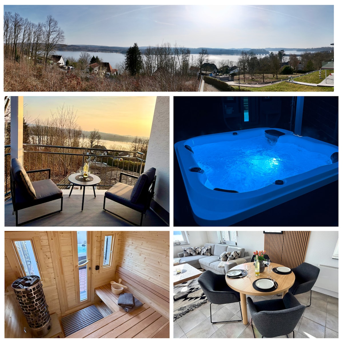 Vår lägenhet har en vacker utsikt över omgivningen. Från panoramafönstret, eller från en av terrasserna. En terrass bjuder in till avkoppling och ligger upphöjd precis utanför dörren. På den andra terrassen finns bubbelpool, grill, sittplatser och eldstad. Parkeringsplatser inkl. Wi-Fi ingår. Vår lägenhet är modern inredd. 65 tums platt-TV och mycket mer. Bubbelpoolen är uppvärmd och tillgänglig för ensam användning under hela året. Det finns inga andra gäster.