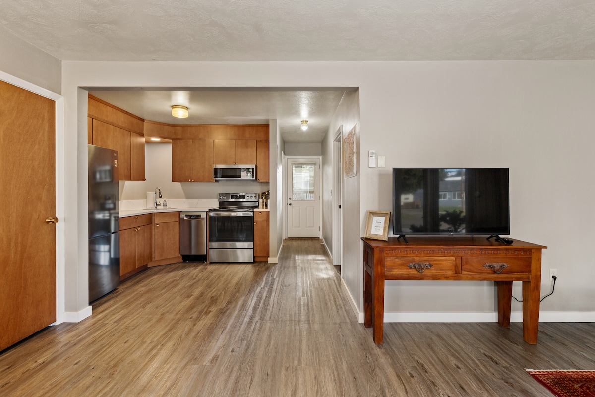 Inbäddad i ett lugnt grannskap ger denna rena 1 sovrum duplexenhet den perfekta basen för dina Wallowa County äventyr. Du får fullständig integritet med alla bekvämligheter som behövs för en kortare eller längre vistelse. Vi erbjuder högkvalitativa sängkläder, bekväma möbler och väggar prydda med lokala konstverk. Det har varit många uppgraderingar till denna retro lägenhet inklusive en komplett köksrenovering våren 2023. Den 2 sovrumsenheten bredvid är också tillgänglig att hyra som ett Airbnb.