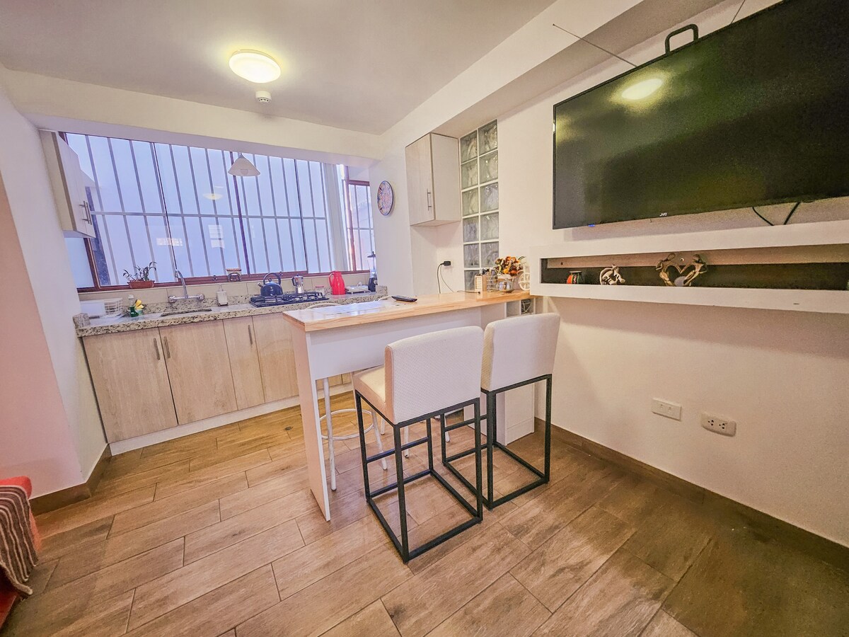 Ljus och bekvÀm studiolÀgenhet pÄ andra vÄningen i ett autentiskt kolonialhus. Perfekt för par som söker komfort och sjÀlvstÀndighet, med alla tjÀnster inkluderade. BelÀget bara 8 minuters promenad frÄn Plaza de Armas, nÀra sevÀrdheter som Koricancha och Sacsayhuaman. Med stormarknader, apotek, bankomater och San Pedro-marknaden bara nÄgra steg bort Àr det det perfekta valet för att njuta av Cusco med charm och praktiskhet.