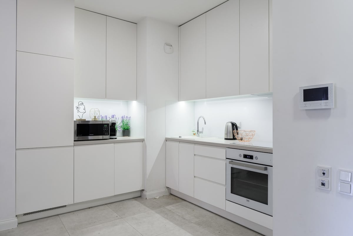 - Lägenhet med balkong i centrum. I den prestigefyllda lägenhetsbyggnaden-Mennica Residence, - Lägenheten har fullt utrustat kök byggt tillsammans med vardagsrummet. - Tillägg, till gästernas förfogande finns ett separat, ogenomträngligt sovrum med säng och skrivbord för att arbeta. - Tillgång till alla golv är tillgänglig med hiss.