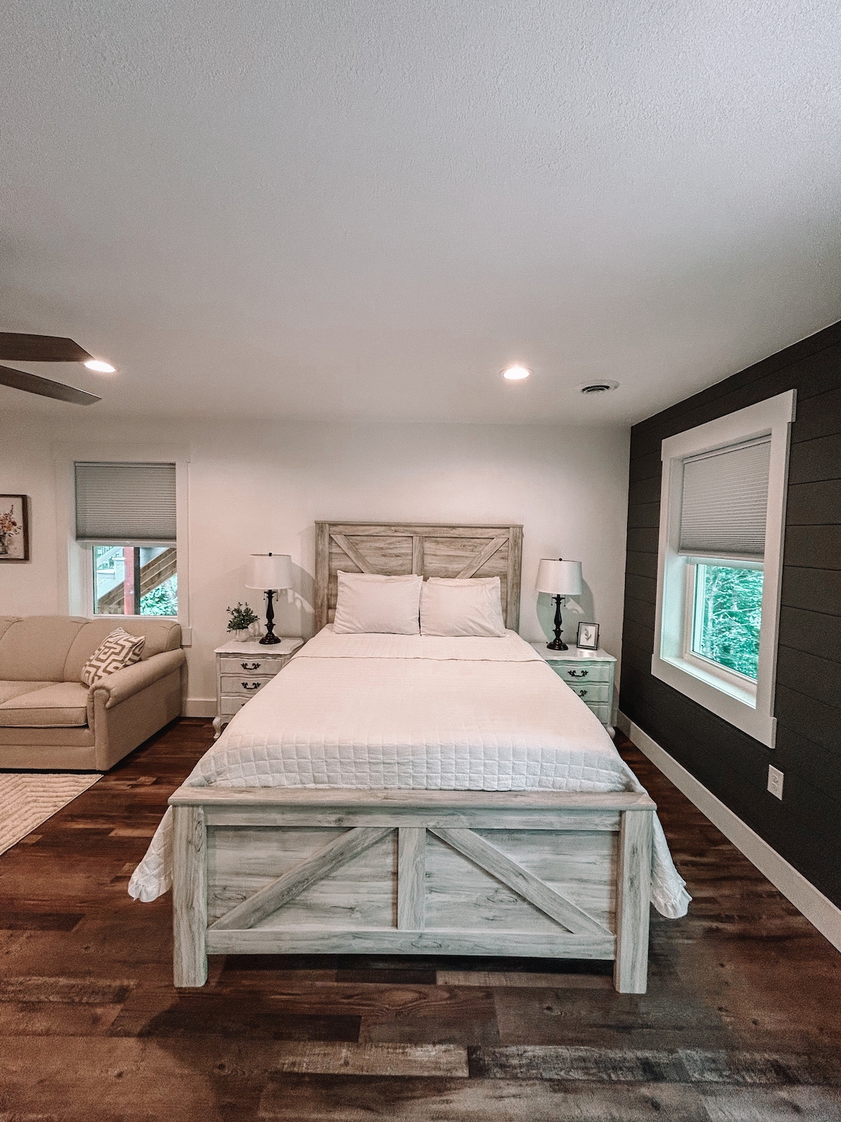 På övervåningen ligger en vindsvåning i studiostil bara några minuter från historiska Jonesborough. Detta mysiga utrymme är ungefär 500 kvadratmeter stort och erbjuder all lyx i hemmet med ett fullt utrustat kök, fullt badrum och privat ingång med knappsats. Centralt beläget, du kan vara var som helst från Asheville, NC till de vackra Smokey Mountains på lite över en timme. Vi har skapat detta utrymme som en tillflyktsort för par så vi ber att barn och husdjur lämnas hemma. Ingen handikapptillgång eftersom detta är en loftsvåning ovanför garaget.