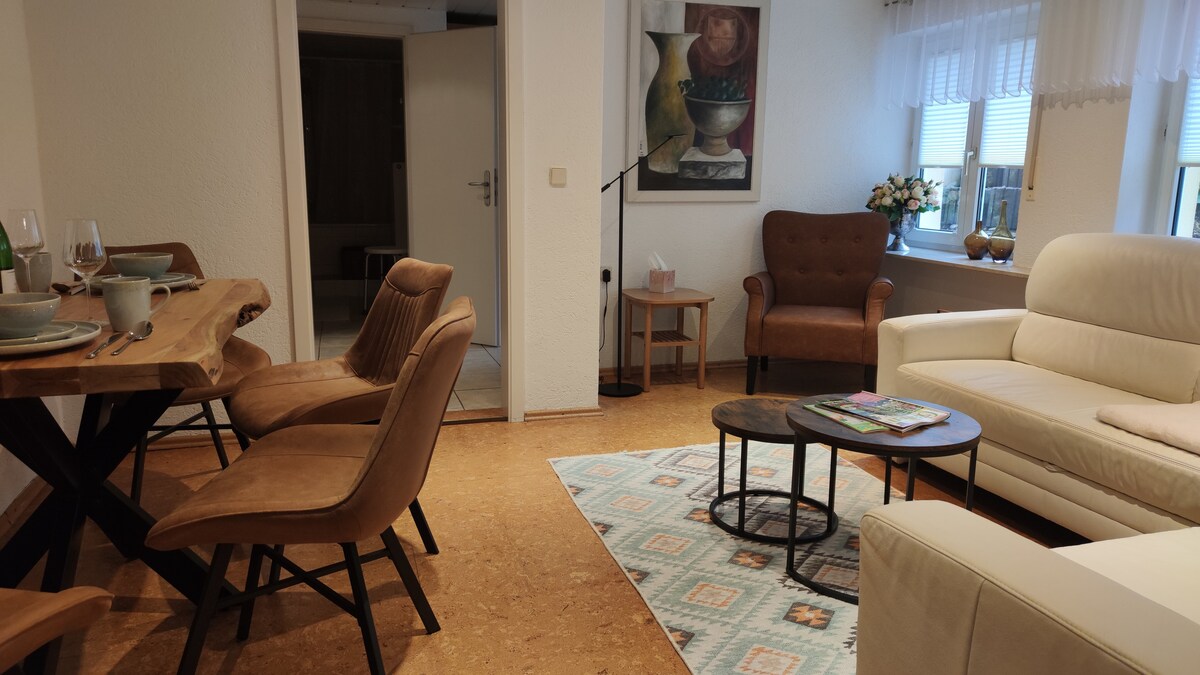 Entspanne dich mit der ganzen Familie. Die Wohnung ist zur alleinigen Nutzung. Bettwäsche und Handtücher sind inklusive. Hochstuhl/Gitterbett können auf Wunsch zur Verfügung gestellt bzw. in der Wohnung für dich vorbereitet werden. Die Küche ist voll ausgestattet. Es gibt vor Ort E-Auto-Ladestationen gegen Gebühr. Vor Ort gibt es auch ein Hallenbad (10x4m, 34°C) und eine Sauna. Das separate Gebäude kann vor Ort stundenweise exklusiv gegen Gebühr gemietet werden. Am fränkischen WasserRadweg