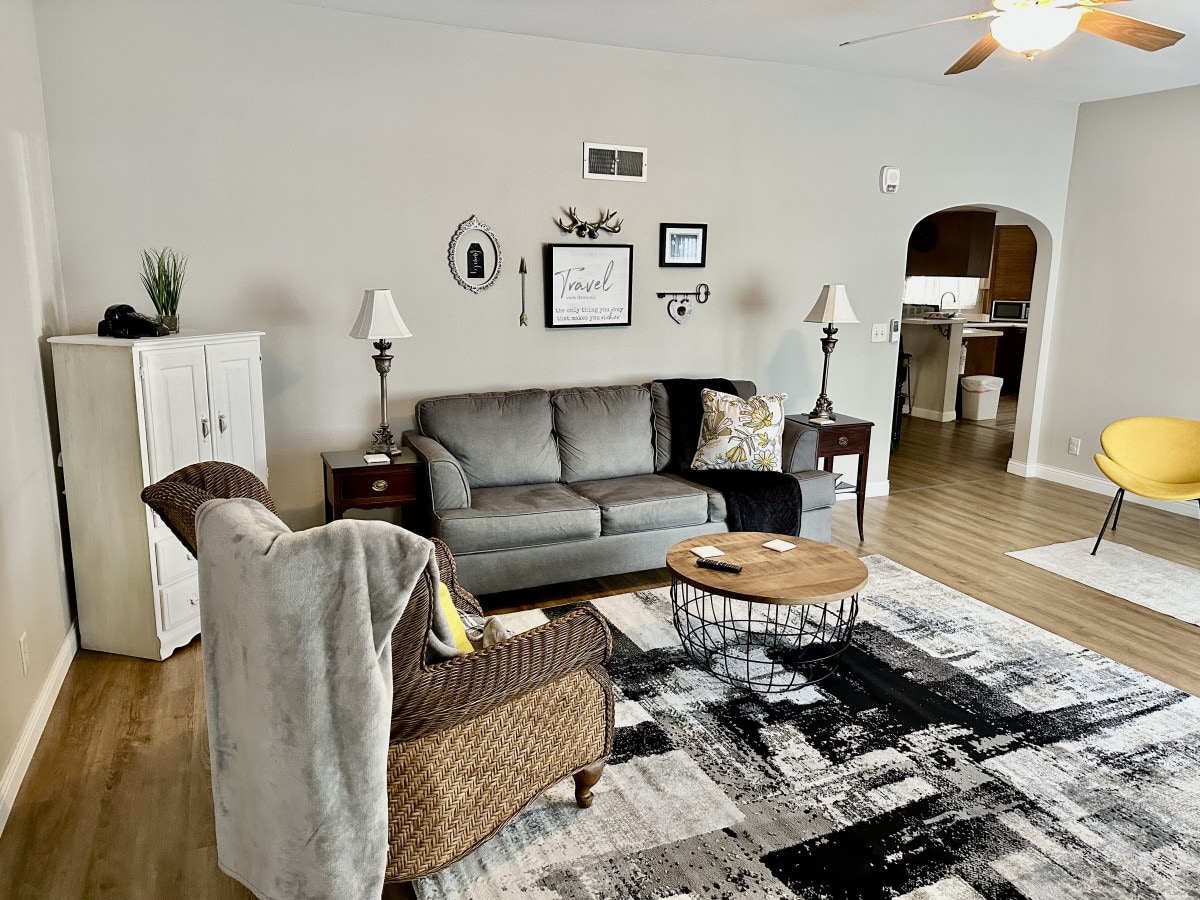Luta dig tillbaka och koppla av i detta lugna, eleganta boende. Minihuset är inte ett riktigt minihus, ett sovrum med 1 queen bed, badrum, kök/vardagsrum. Lazy boy liggande kärlekssäte, och en lazy boy recliner (mycket bekväm) för att titta på en film framför en konstgjord öppen spis. Köket är inrett med allt du behöver för att förbereda en hemlagad måltid. Mikrovågsugnen är en luftfritös/mikrovågsugn. Njut av din kväll/morgon sittande på den täckta verandan med din favoritdryck.