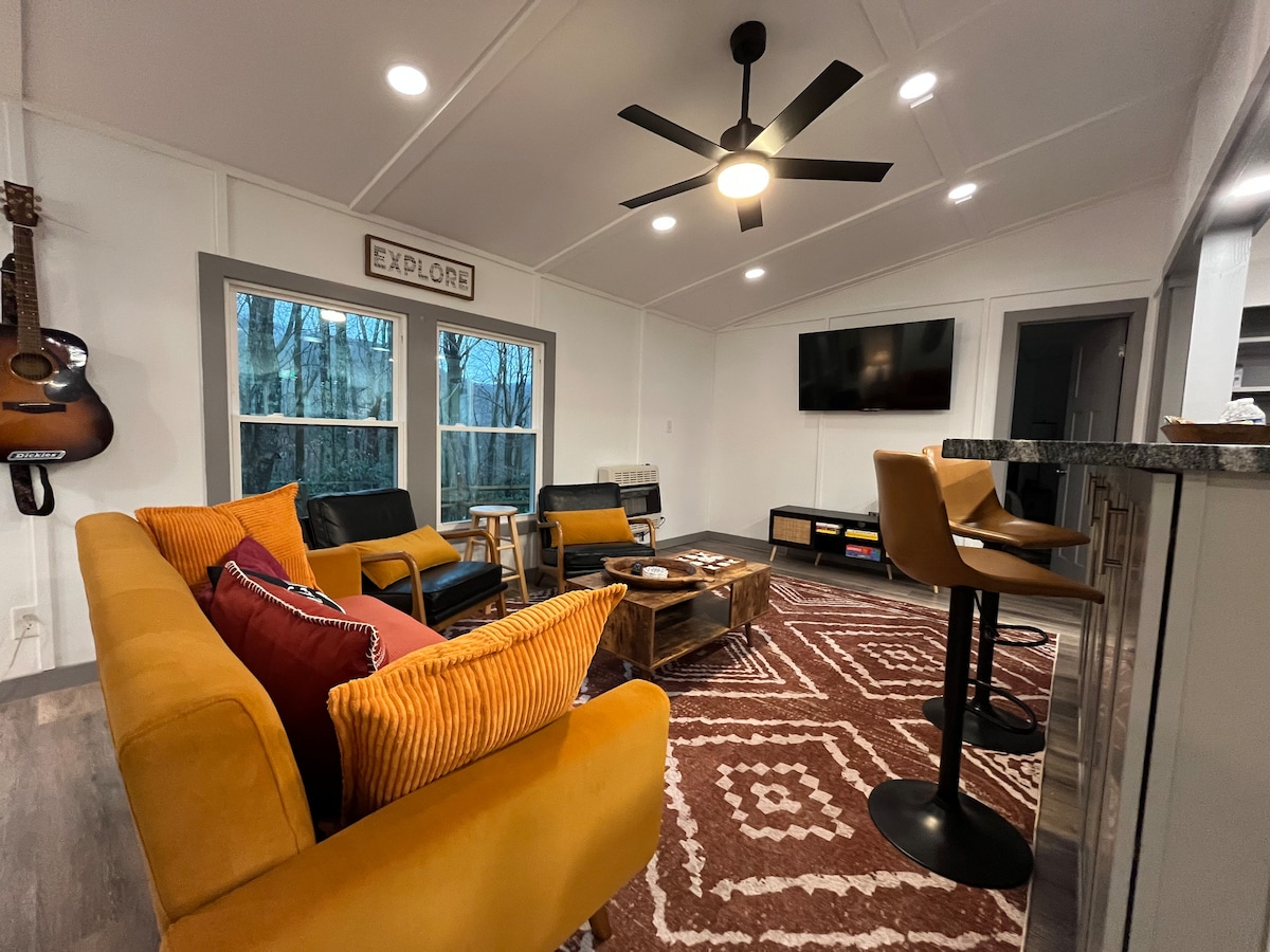 Detta är ett renoverat pensionat som byggdes 1940. Det har bra 1940-talets funktioner, som trägolv, högt i tak och stora fönster. Vi tog bort 2 stora väggar, vilket öppnade upp kök/matsal/vardagsrum till ett stort utrymme. Gästhuset har nu en öppen, ljus känsla, med en häftig, mitten av århundradet inredning. Vår fastighet består av 3 tunnland, men är bara ett kvarter från centrala Boone. Utsidan är mycket avskild och naturlig — med en skogig sluttning, bäck och stor trädgård.