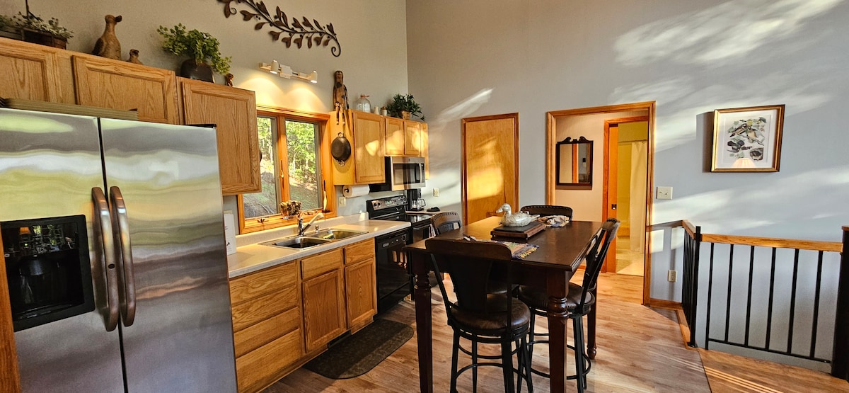 Vackra bergsutsikt med fantastiska solnedgångar. Två stora omslutande däck för att njuta av morgonkaffe och kvällssolnedgångar. En naturskön stig ligger bara några steg från ytterdörren och leder till Watauga Lake, med tillgång till sjö. Offentlig båtlansering finns 1,5 km från stugan. Två rymliga sovrum med klädkammare. Ett allrum fungerar som ett tredje sovrum eller ett spelrum. Fullt utrustat kök med allt som behövs för matlagning.