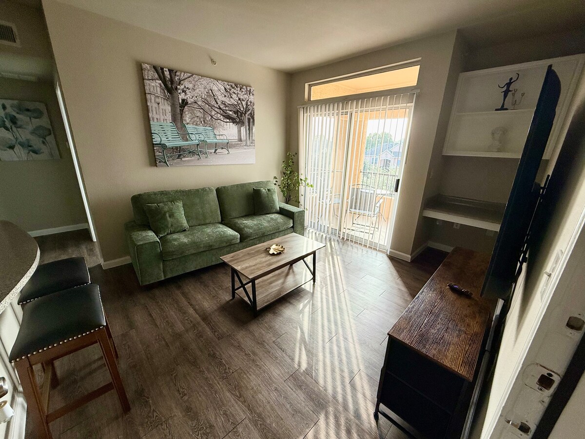 Upptäck symbolen för ett modernt boende i vår vackert utformade lägenhet med två sovrum och två badrum! Detta fantastiska boende erbjuder en blandning av lyx och bekvämlighet, med: *Rymligt vardagsrum *Öppen planlösning *Google Fiber Internet/WiFi *65" Smart TV *STORT kök *Rostfritt stål apparater *Comfy King & Queen Beds *ENORMA klädskåp *Uteplats *Tvättmaskin och torktumlare Inuti lägenheten *24/7 Fitness Center på plats * Pool i resort-stil Och så mycket mer! Perfekt blandning av lyx, komfort och bekvämlighet!