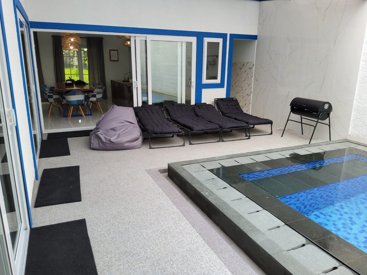 "Välkomna till vår fantastiska lyxvilla i Sentul City, denna vackert utformade villa kombinerar traditionell träarkitektur med moderna detaljer, vilket skapar en unik och fängslande atmosfär." Med tre rymliga sovrum, ett generöst vardagsrum och en OÄNDLIGHETSBASSÄNG som verkar sträcka sig in i den fantastiska utsikten över Salak Mountain, känns varje morgon som en ritual. Detta otroliga boende erbjuder en lugn och fridfull atmosfär. [INTE I PUNCAK]