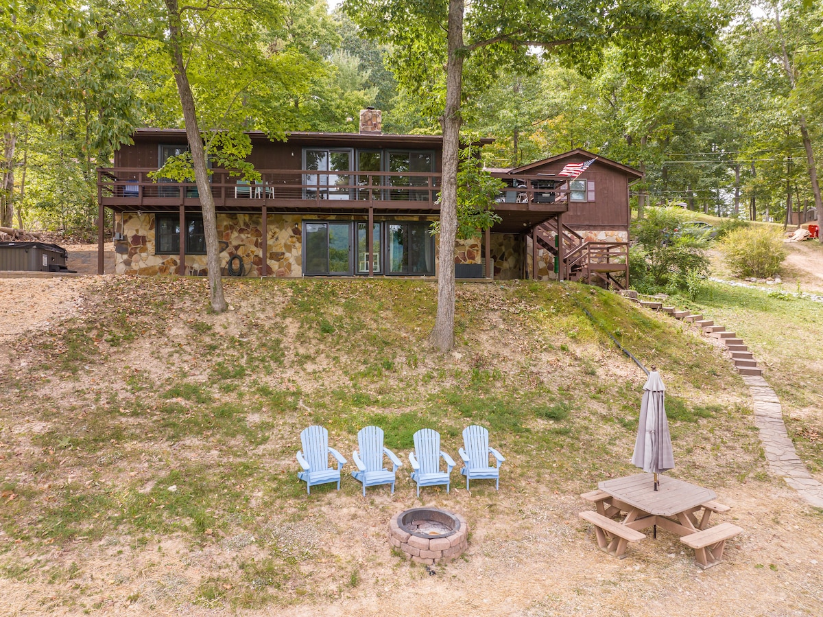 Fly till Lakeside Serenity, den perfekta semestern i Lake Shannondale i Harpers Ferry, WV! Med 180 fots tillgång till sjön och en privat brygga erbjuder vi paddelbrädor, kajaker och flytvästar att njuta av. Förundras över den fantastiska panoramautsikten från däcket, eldstaden eller bubbelpoolen för att koppla av medan du tittar på solnedgången eller tittar upp på stjärnorna på natten. Inuti hittar du ett rymligt 3 164 kvm stort vardagsrum, inklusive 5 sovrum, 3 badrum, bastu, eldstad, fotbollsbord och biljardbord.