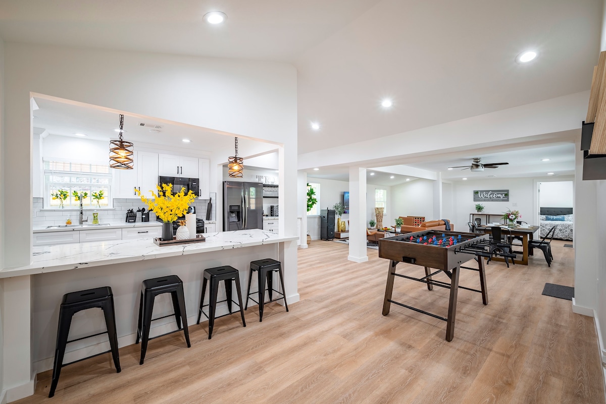 När du går in i en hektar grön baldakin med mogna ekar, upplever du den lugna atmosfären. Dina barn och vänner är glada att se roliga arkader, pingisbord och spel att spela. Du kan knappt vänta på att få hoppa i badkaret och titta på en film. Du ser parken, 2 hus bort, och kan knappt vänta på att få jogga där, åka en cykeltur eller gå ut med hunden i den friska luften. I kväll rostar du marshmallows i eldstaden och lagar mat utomhus på grillen, medan du tar en klunk av ett fint vin. Boka detta boende