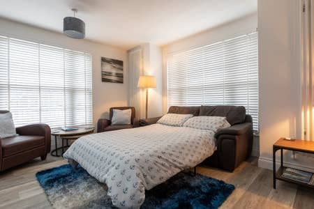 Vår strandlägenhet ligger i ett vackert ombyggt viktorianskt periodhus, med egen privat balkong, mindre än 5 minuters promenad från Minnis Bay Beach. Birchington Station (10 minuters promenad) ger goda förbindelser till London och närliggande kustreträtter. Det finns en parad av butiker med en närbutik, fish and chips, café och mikropub 2 minuter bort. Minnis Bay Brasserie ligger 5 minuters promenad bort längs promenaden. Det finns bra rutter för promenader/löpning/cykling i alla riktningar.