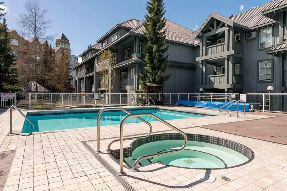 Enhet 433 av Aspens på Blackcomb, nära Blackcomb Village, restauranger och barer, shopping, spritbutik, uthyrning/ tuning, hissar, Blackcomb biljettkontor, Snow School, Bunny Hill, Lost Lake Park. Du kommer att älska mitt ställe på grund av läget, den varma hemkänslan. Bra för par, affärsresenärer och familjer med barn. Privat balkong med utsikt över bergen med grill. Pool och badtunna året runt.