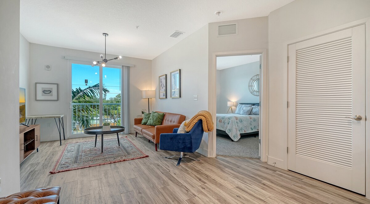 Denna nybyggda lägenhet har en överdimensionerad köksö och en skjutreglage med utsikt över centrala Sarasota. Delade bekvämligheter inkluderar: ett gym; solnedgångsdäck; massivt takterrass med pool; lusthus med storbilds-TV, öppen spis och våt bar; en hundlöpning; och tillgång till det intilliggande Cowork office-utrymmet. På plats finns också Motoneko Cafe, en fullservice kaffe/ramen-butik som också serverar te, espressodrycker och snacks.