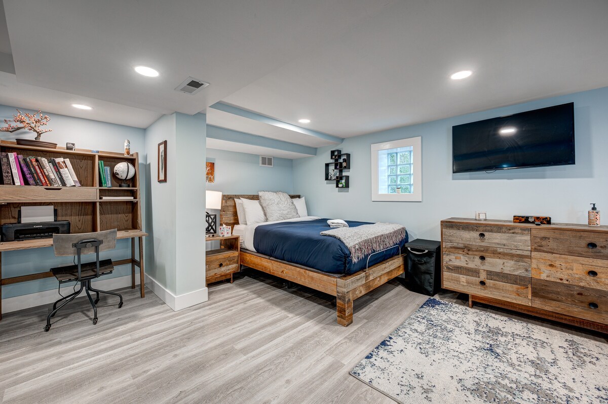 Denna unika lägenhet i Bucktown är redo att vara värd! Boendet har en dold trappa som leder ner till sviten på nedre våningen! Bottenvåningen har allt du kan behöva med ett vackert fullt utrustat kök och avkopplande vardagsrum, men för när du behöver lite extra utrymme, gå ner i studiostil utrymmet med ett pentry, arbetsstation och sov-/vardagsrum. Den blå linjen tågstopp ligger 7 minuters promenad bort och Ohare och Midway Aiports ligger 30 minuters Uber-resa bort.