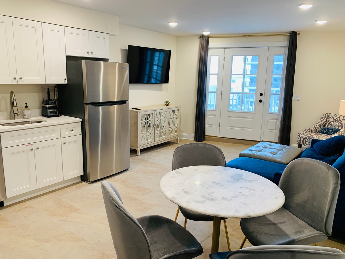 Vi är ett 5-stjärnigt Airbnb. Vi arbetade hårt för att förtjäna det och ännu hårdare för att behålla det. Vårt mål är att tillhandahålla den renaste och vackraste upplevelsen i Wildwoods. Vackra solnedgångar varje kväll. Bekvämligheterna inkluderar fullt utrustat kök, kylskåp under noll, diskmaskin och alla redskap. Tvättmaskin och Torktumlare ingår. Huvudsovrum med dubbelsäng och privat kakeldusch. Vardagsrum med matplats. Båda tv: arna är smarta, Hulu, Netflix etc.