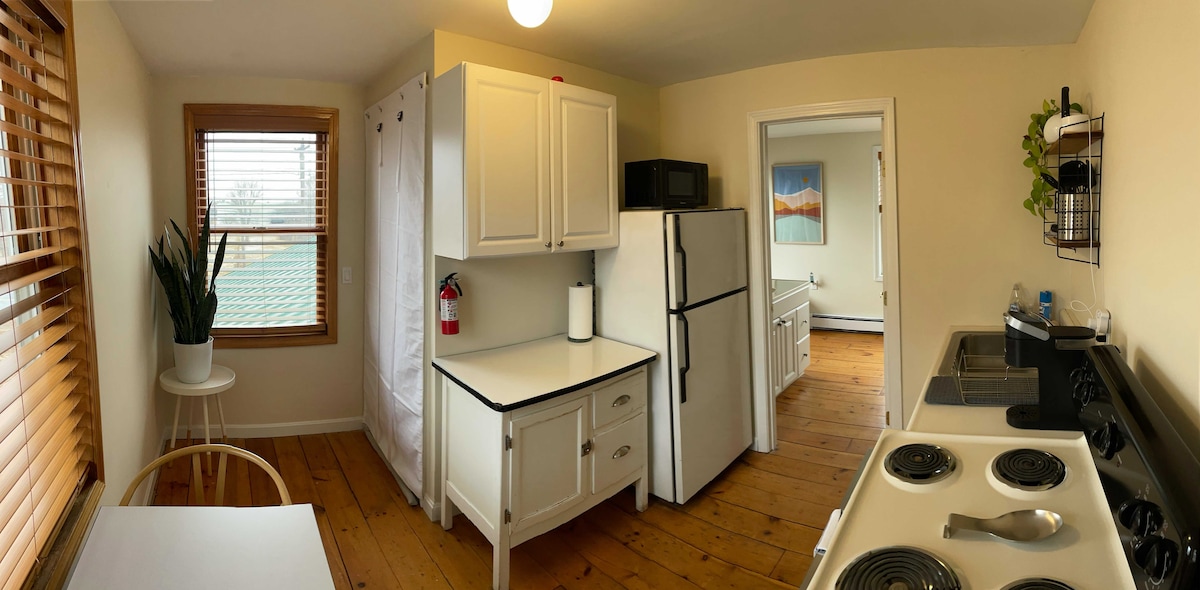 5 minuter till stranden, privat däck, mysig lägenhet bara ett stenkast från Scratch Bakery. Ta en bagel, eller min personliga favorit, mandel hästsko, och koppla av på däck promenad till stranden. Enrumslägenhet på tredje våningen, fullt utrustat kök. Allt du behöver för en helg eller en vinteruthyrning. Trappan är brant och kanske inte lämplig om du har problem med rörligheten. Sluttande tak. Första svaret är alltid, "Det är mycket större än bilderna visar. Snabbt wifi.