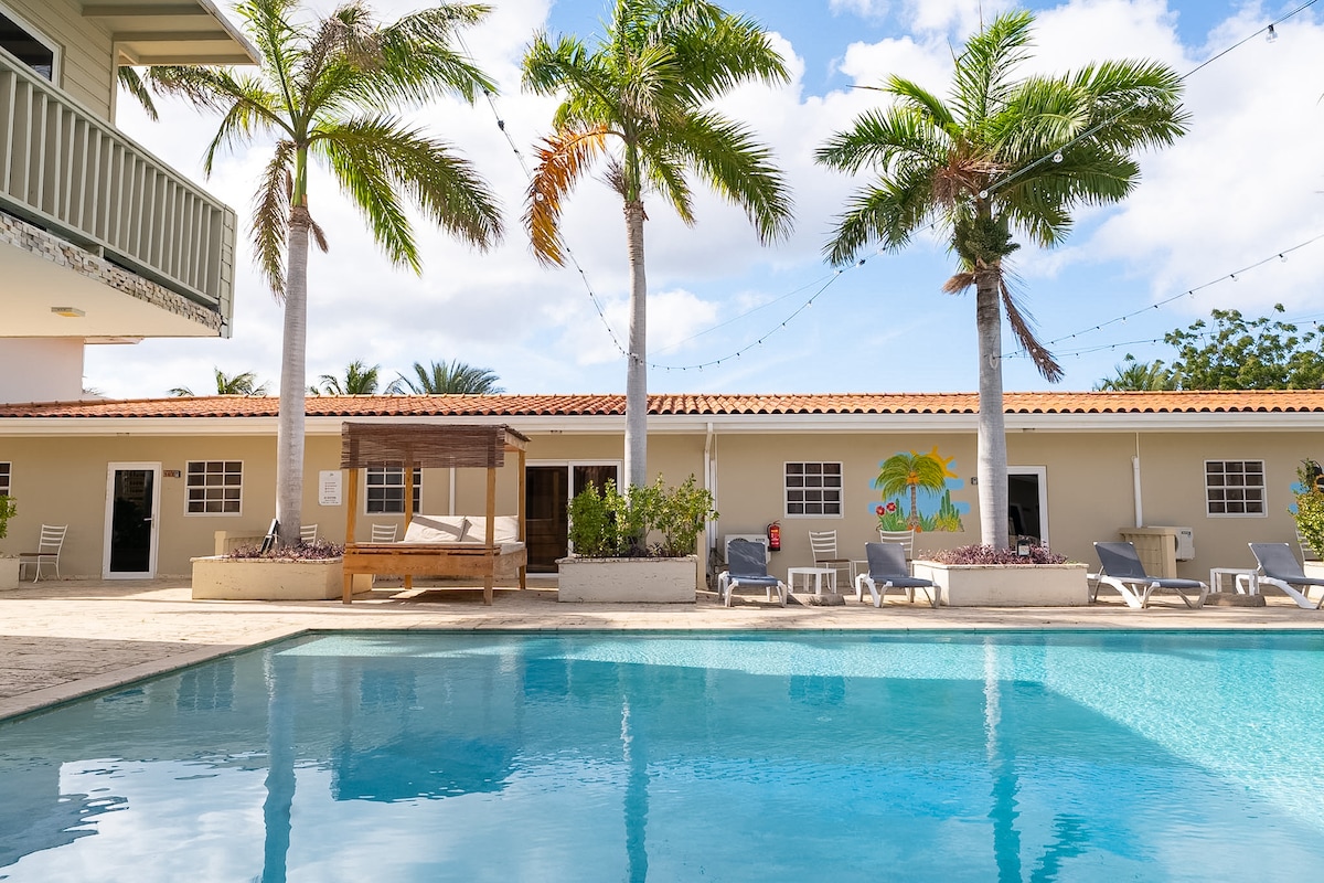 I detta exotiska miniparadis med 3 unika lägenheter handlar allt om dig! Bara 8 minuter från Mambo Beach och 10 från Jan Thiel, denna pärla väntar. Min tropiska (ätbara) trädgård med palmer, färgglada blommor, papegojor, kolibrier och leguaner är en sann ögonfångare. Grillen, uteköket, baren, tvättmaskinen och diskmaskinen är alla dina att använda. Ta ett uppfriskande dopp i poolen eller koppla av på en solstol eller i en hängmatta under ett bananträd. Bon Bini to dushi Happy Curoase!
