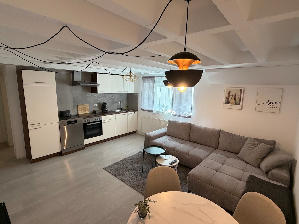 Vacker, mysig lägenhet mitt i centrum av Achern. Lägenheten är till uthyrning för 2 vuxna med 1 barn. Du kan koppla av och dela i vår vackert anlagda trädgård. Bageri, butiker och restauranger ligger bara några minuters promenad bort. Här i Achern hittar du ett antal kulturella och sportiga erbjudanden i omedelbar närhet (utomhuspool, utgrävningssjöar, stadsträdgård,...) Tågstationen ligger ca. 15 minuters promenadavstånd. TV tillgänglig med antenn-TV och Wi-Fi