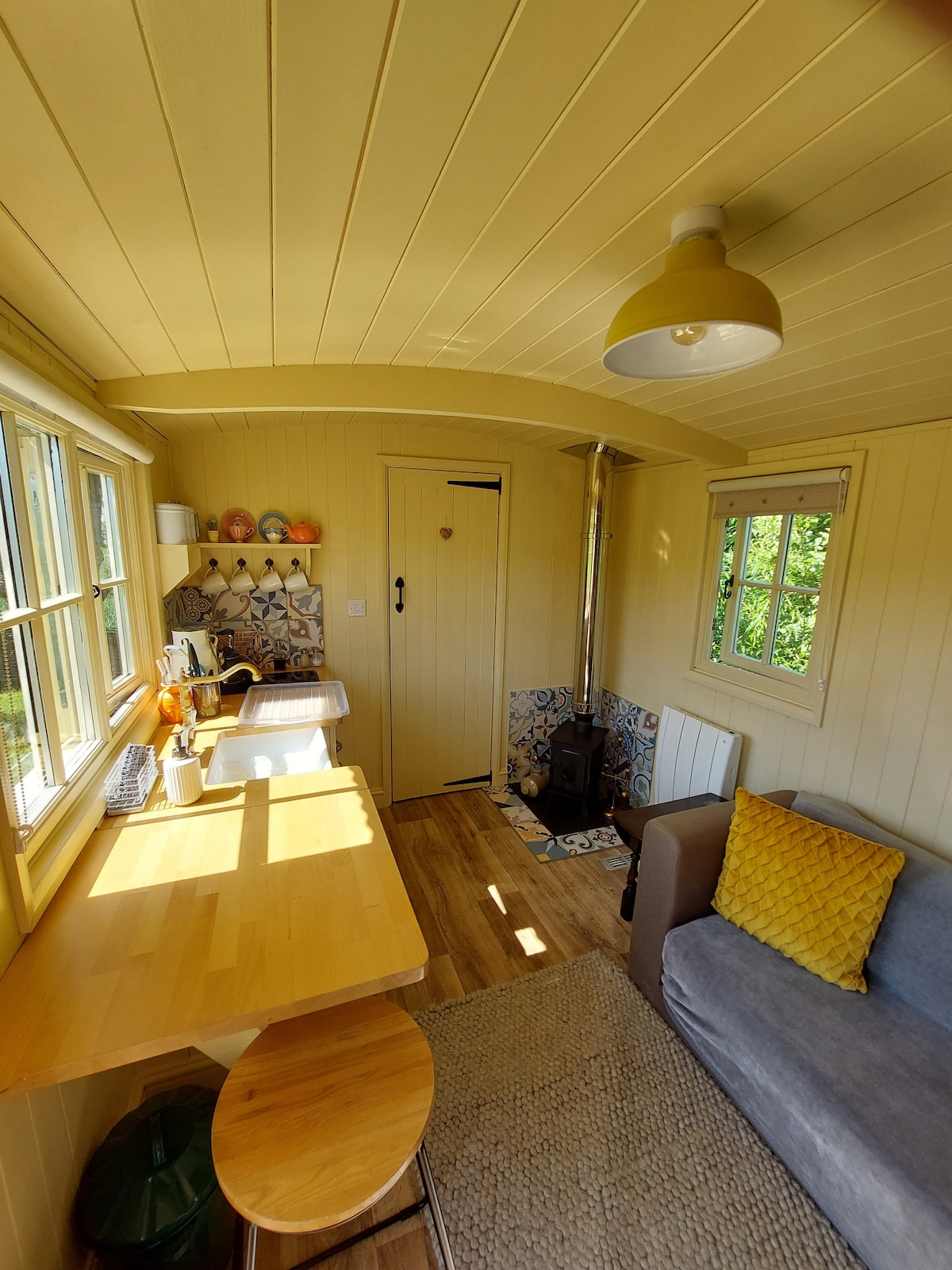 Humble Hut är mysigt med allt du behöver för att känna dig som hemma. På varma dagar, öppna den övre holländska dörren och låt luften flöda igenom och när det är kallt är det bra att mysa vid elden. Utanför finns ett privat område som är perfekt för solbad eller lunch eller ett glas vin. Det finns sittplatser runt stugan så oavsett tid på dagen kan du hitta en plats att sitta i solen och beundra den fantastiska utsikten. På natten om himlen är klar kan du stjärnskåda eftersom vi befinner oss i ett mörkt himmelsområde.