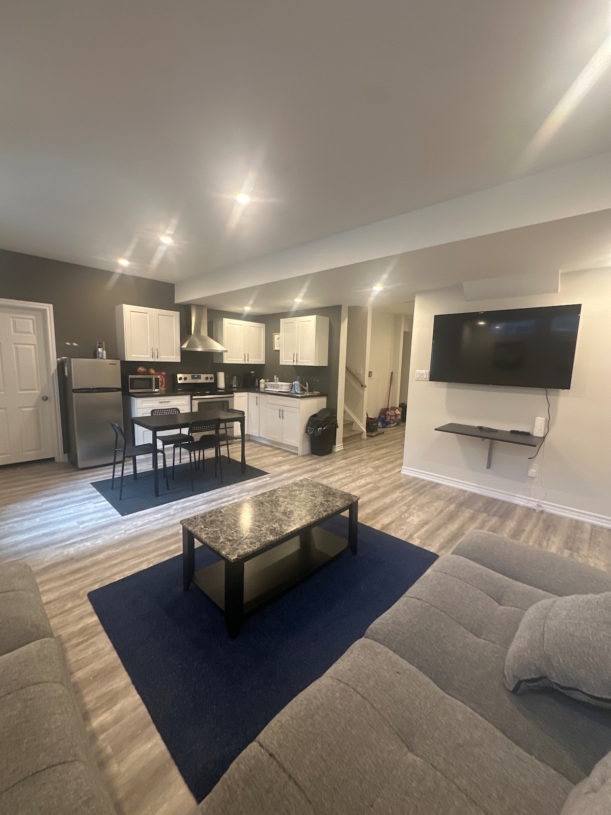 Enjoy a comfortable 2-bedroom, 2-bath basement suite with high ceilings, Wi-Fi, and workspace, ideal for business travelers, students, or visiting families. The suite offers a fully equipped kitchen with stainless steel appliances and basic cooking essentials. Relax in the seating area for up to 4 guests. Please Note: Parking is not available. Laundry facilities are not provided. As this is a basement unit, guests may occasionally hear normal household sounds from the upstairs home