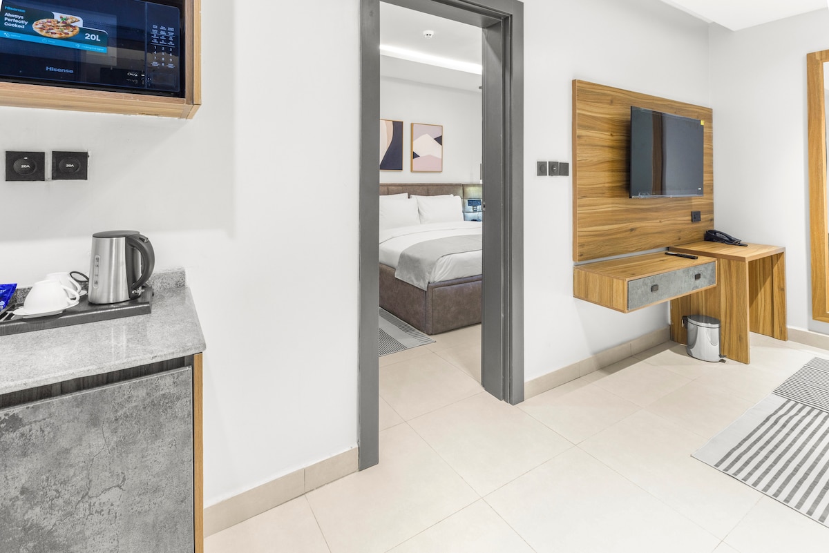Upplev det bästa av Abuja i vårt fridfulla rum som ger en upplyftande energi. Med mjuk belysning under sängen och varma toner lyser upp din vistelse för en verkligt avkopplande upplevelse. Njut av en vilsam natts sömn på vår lyxiga dubbelsäng, håll dig underhållen med smart-TV och Netflix och håll kontakten med snabbt Wi-Fi. Njut av ett eget badrum med värmare för ett varmt mysigt bad och minikylskåp. Perfekt för ensamresenärer, resor, par och företagsledare.